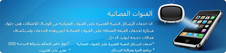 وأيضا قمنا بتعزيز العديد من برامج الرسائل النصية القصيرة على القنوات الفضائية ، مثل الجهاز الخاص للتحكم بشريط الدردشة على القنوات الفضائية ومواقع فلترة و مراقبة الرسائل والتقارير ، ونعتبر الشركة الرائدة حاليا في تقديم الخدمات التفاعلية على القنوات الفضائية التي تلبي احتياجات القناة وتوفر أكبر متعة للمشاهد مع وجود الاستخدام الكبير للهواتف المحمولة وللحصول في نفس الوقت على طريقة جديدة لزيادة الايرادات من طرف المشاهد .